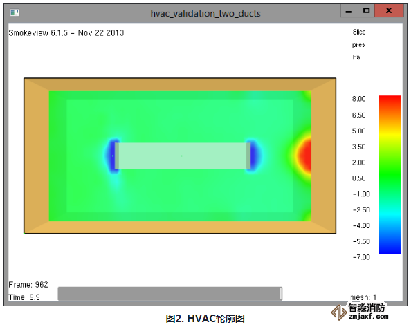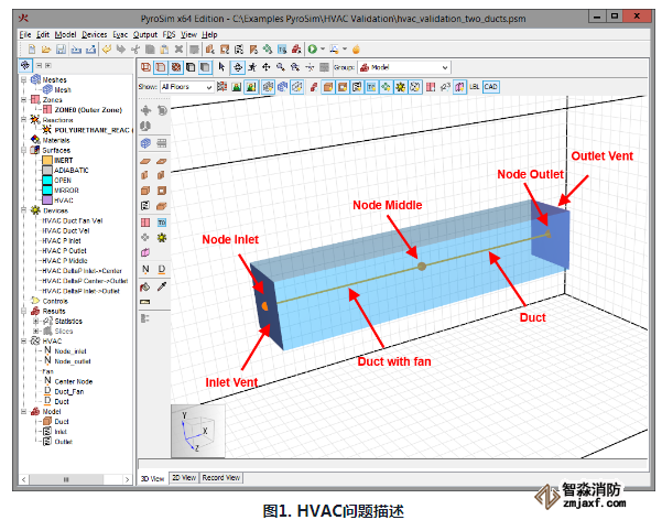 HVAC模型如下图1所示,其中有三个HVAC节点和俩个HVAC管道。左侧的风道有一个风扇,其恒定流量为损耗项是由于直径管道的粗糙度。总风管长度为右侧的导管易于计算该部分的预期压降。1.0m3/s0.001 m 0.3048m 2.0m. 四川消防评估软件