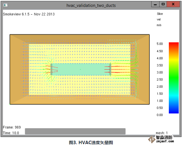 排气口的预期速度为6.25m/s。放置在通风口中堂的气体速度测量装备记录的速度为5.8m/s。请注意,Smokeview会进行插值,这很接近6.25m/s。
